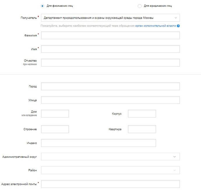 - В электронном виде через сайт Правительства Москвы, выбрав в качестве получателя Департамент природопользования и охраны окружающей среды.