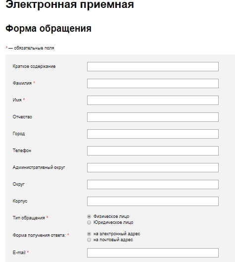 Форма для обращения граждан на сайте ДО Москвы выглядит таким образом: