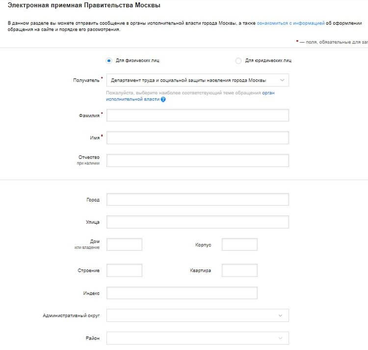 Для этого необходимо будет выбрать соответствующего адресата из предложенного системой перечня учреждений («Департамент труда и социальной защиты населения Москвы») и предоставить информацию следующего характера:
