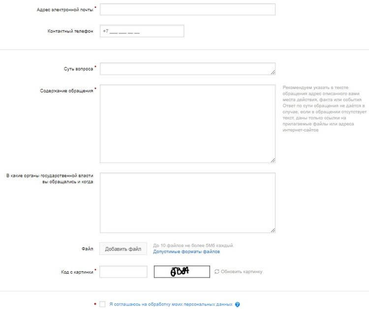 • текст обращения, где следует кратко описать, когда и при каких обстоятельствах были нарушены прав заявителя, в чем это выражалось и по возможности дать ссылки на нормы закона, которые были не соблюдены. В этом поле также можно указать должностных лиц, которые, по мнению пользователя, не выполнили требования закона, и наименование учреждения, где произошел описанный инцидент.