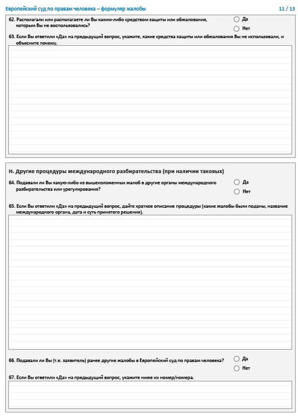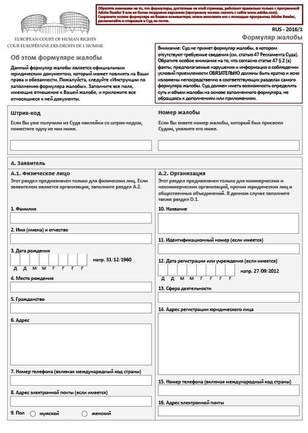 Для обращения с жалобой потерпевший должен направить в ЕСПЧ формуляр, заполненный в соответствии с требованиями 34 статьи Конвенции и Регламентом Суда. Соответствующие разделы документа должны содержать в себе все необходимые сведения, иначе в его принятии будет отказано. Необходимо указать: