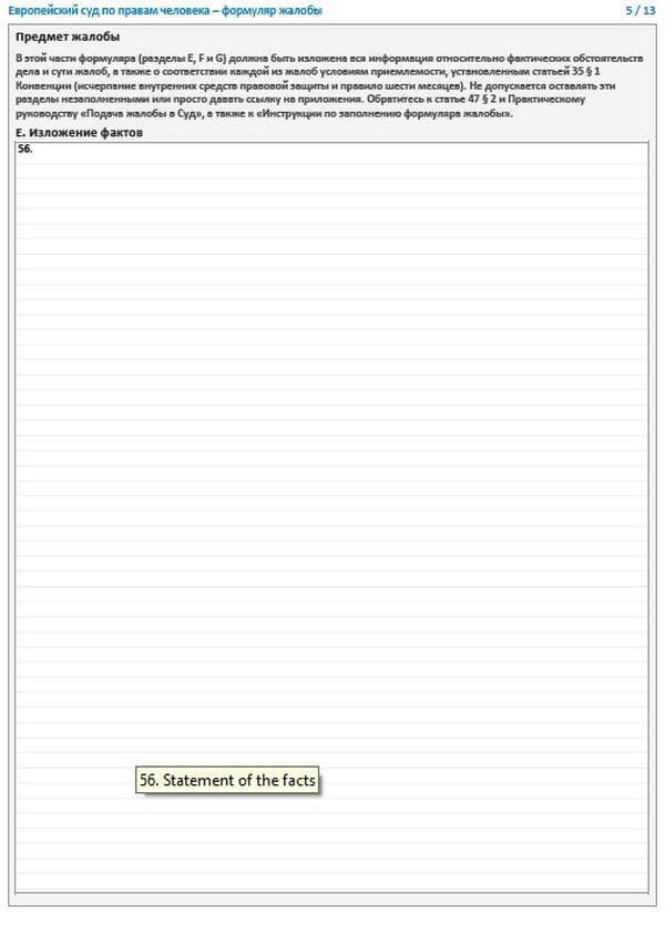 • Изложение фактов. В этом разделе потерпевший ясно и кратко описывает обстоятельства дела, придерживаясь хронологического порядка событий. Для полноты картины нужно точно указать даты изложенных событий и приложить документы, которые будут подтверждать наличие оснований для обращения в Европейский суд по правам человека.