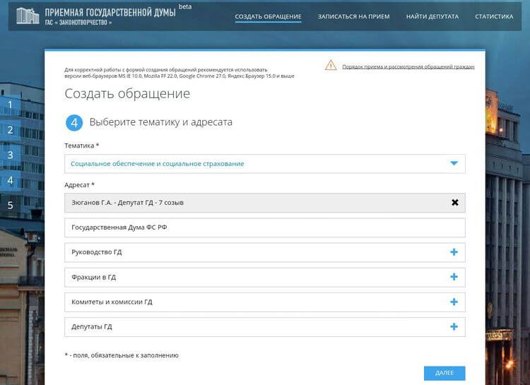 На базе Государственной информационной системы «Законотворчество» работает Приёмная Государственной Думы — https://priemnaya.parliament.gov.ru. Чтобы пожаловаться через неё Зюганову необходимо:
