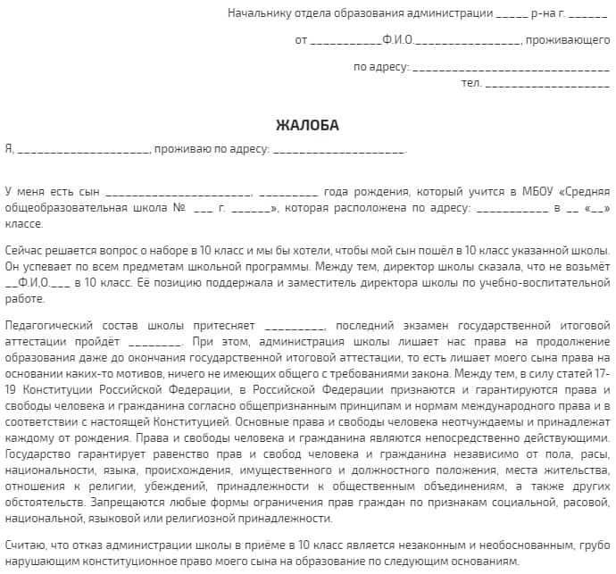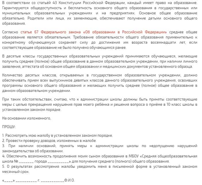 Скачать образец жалобы на отказ в приеме в школу в Департамент образования
