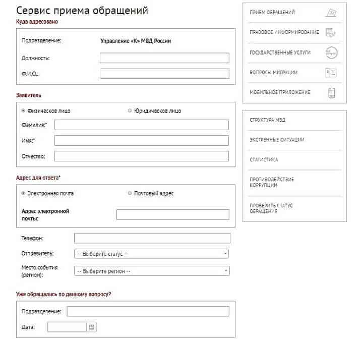 - Онлайн через специальную форму на сайте Министерства внутренних дел РФ xn--b1aew.xn--p1ai/request_main, где можно точно указать, кому адресована жалоба. Порядок подачи такого обращения не имеет особых отличий, поэтому пользователь должен точно указать свои личные данные, выбрать способ получения ответа и максимально точно описать обстоятельства, побудившие его обратиться за защитой своих прав. В поле «Текст обращения» необходимо сообщить адрес мошеннического сайта и любые сведения, которые могут быть использованы для анализа ситуации.