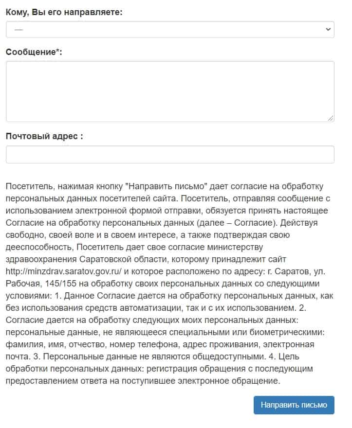 • Онлайн через электронную приемную Ведомства http://www.minzdrav.saratov.gov.ru/on-line/q1.php