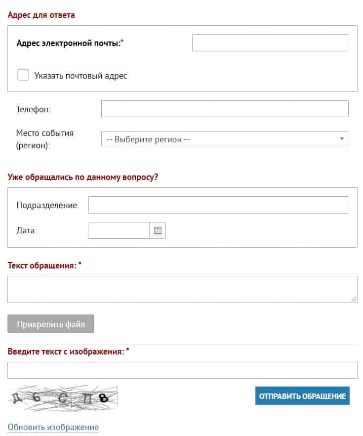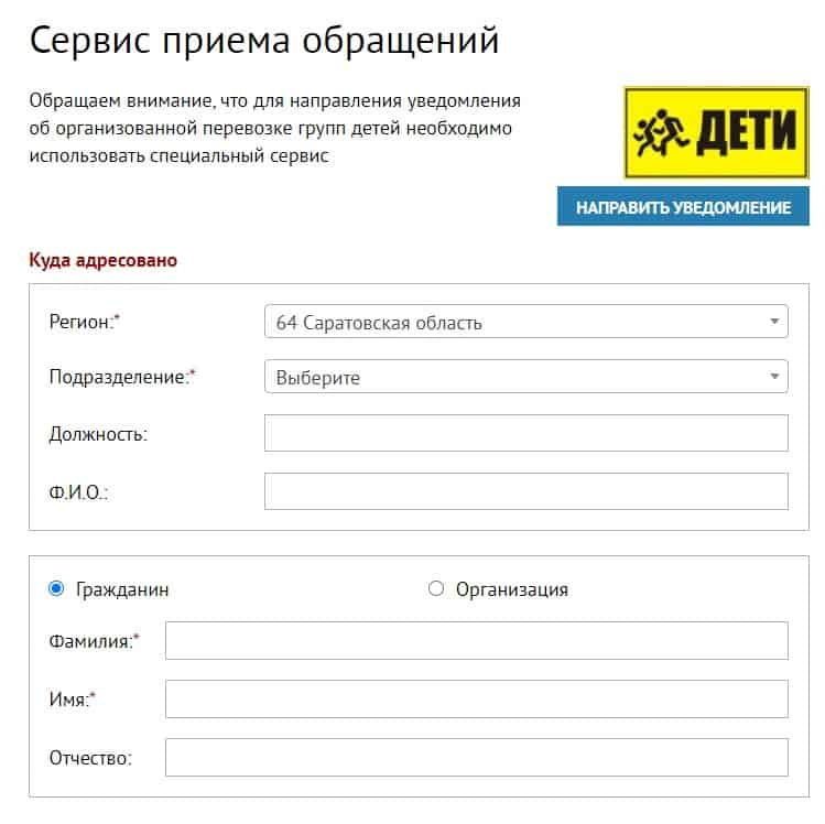• Через сервис приема обращений на сайте Ведомства ГИБДД.рф. Для этого в поле «Регион» следует выбрать необходимую опцию и указать всю запрашиваемую информацию.